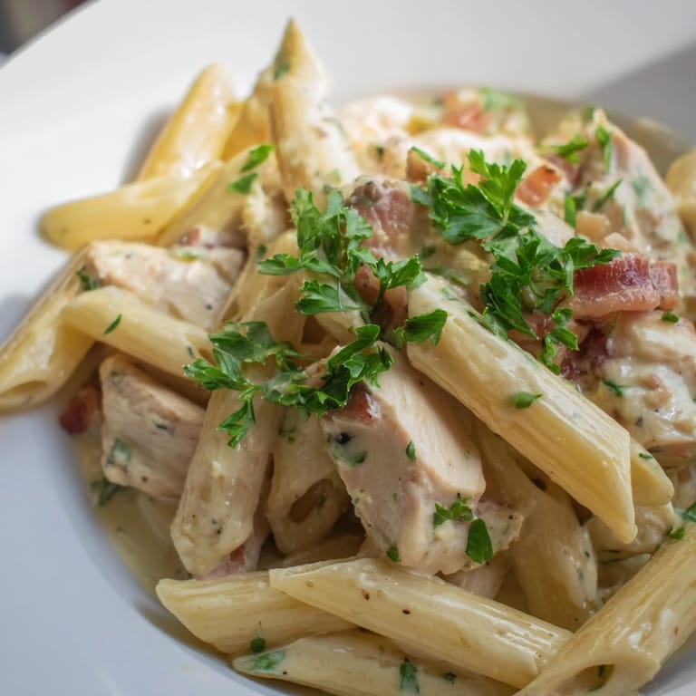 Save The skillet was still warm from breakfast when I decided to throw together what scraps I had left in the fridge. A package of bacon that needed using, chicken breasts I'd meant to grill, and a wedge of Parmesan I couldn't stop nibbling. What started as a clean-out-the-fridge moment turned into something my family now requests by name. The cream sauce bubbled up rich and golden, clinging to every ridge of penne, and I realized sometimes the best recipes aren't planned at all.