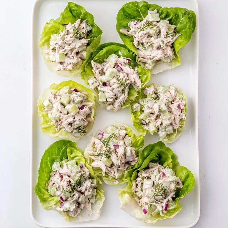 - Spoon the chicken salad into each lettuce cup, piling it high but not so high it spills over the edges.